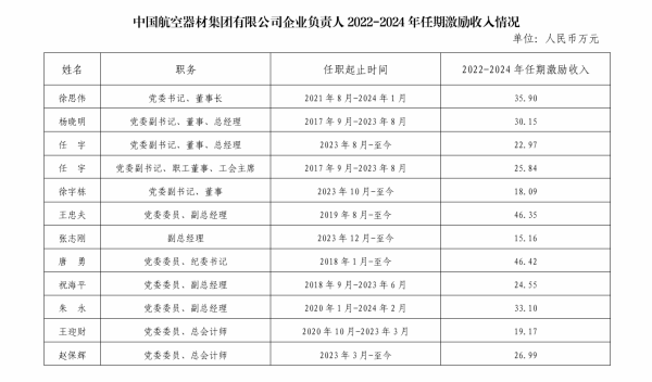 中国航空器材集团有限公司企业负责人2022-2024年任期激励收入情况